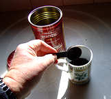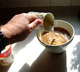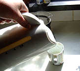 | Push the plunger on the cafetiere, and pour out one cup of brewed coffee. Add it to the milk in the mixing bowl Then add half a cup of single cream, and stir the whole lot until mixed well. | ![]() |